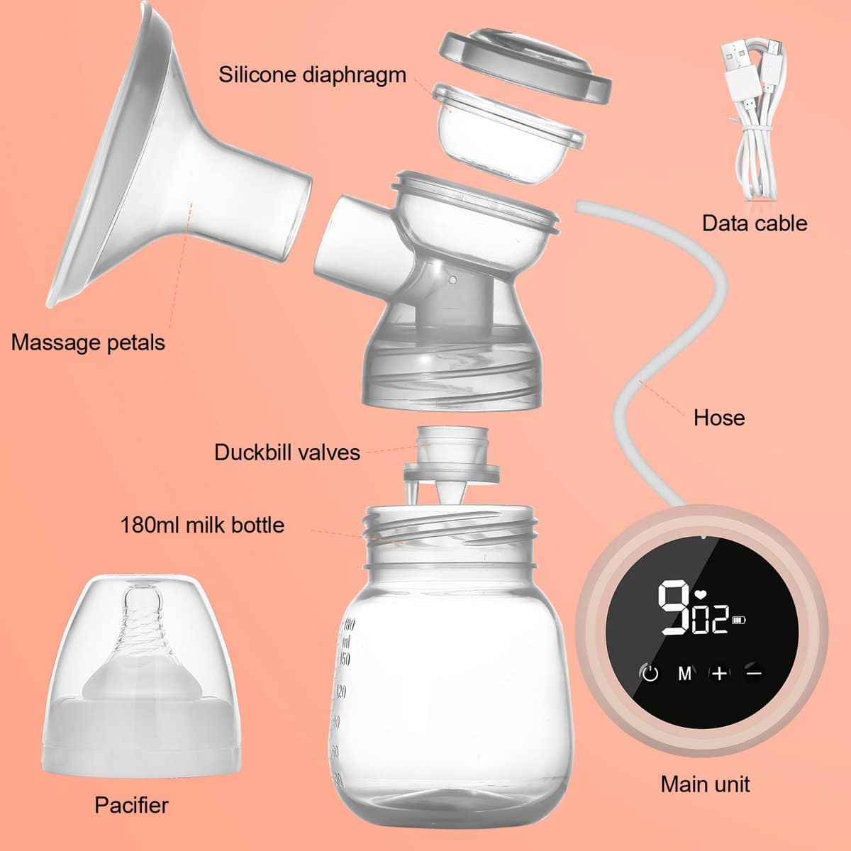 Ingebouwde 1200mAh lithium batterij. Volledig opgeladen in drie uur en voldoet aan de dagelijkse behoefte om de stress van melkstagnatie te elimineren. Kan op verschillende manieren worden opgeladen via de meegeleverde USB-kabel.