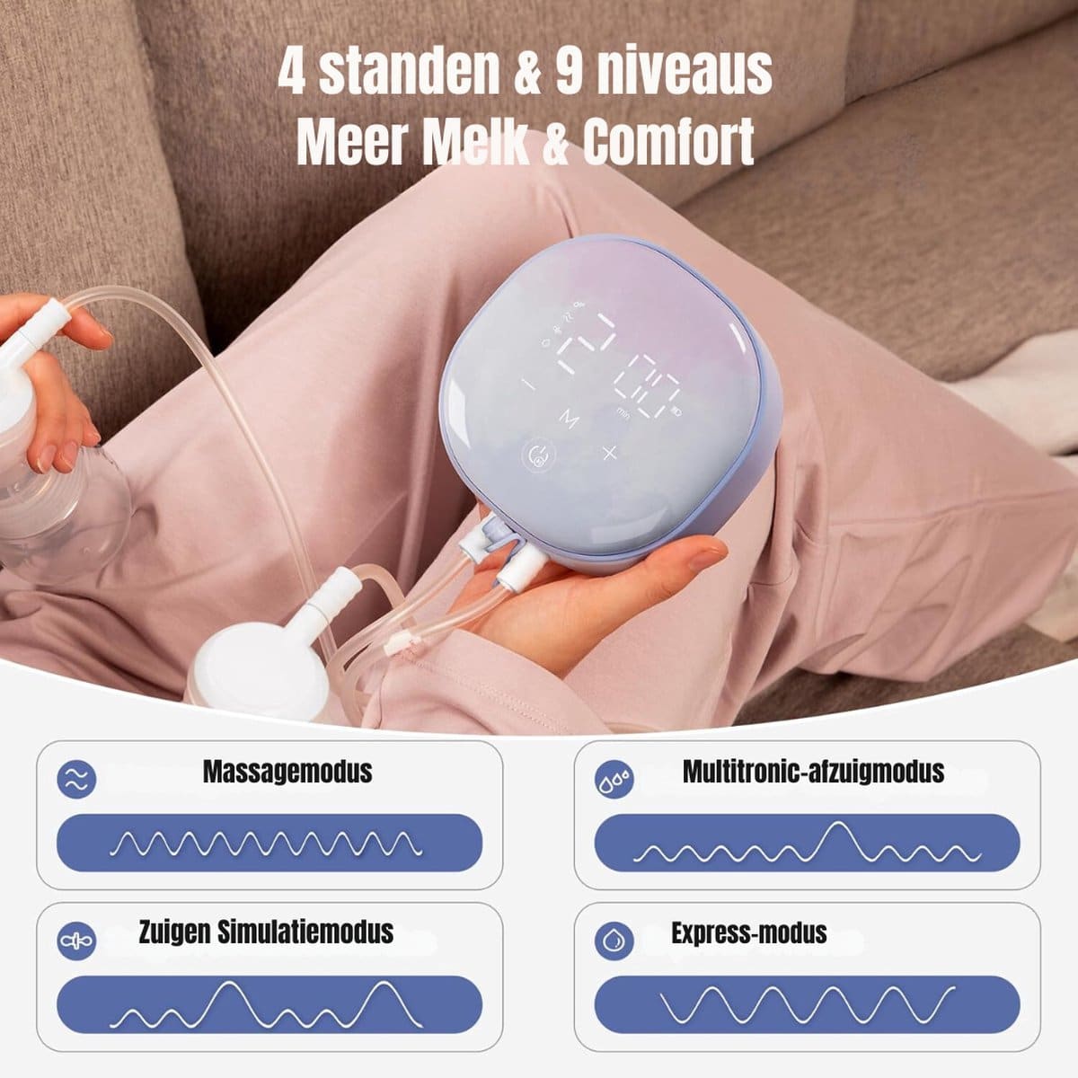 - Instelbare zuigkracht: Pas de zuigkracht aan voor optimaal comfort en een persoonlijke kolfervaring.